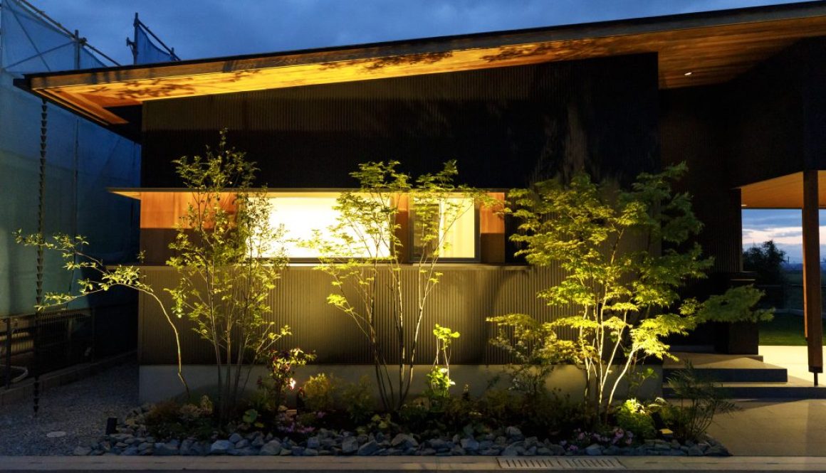 外観は黒のガルバリウム鋼板と木を基調に統一。